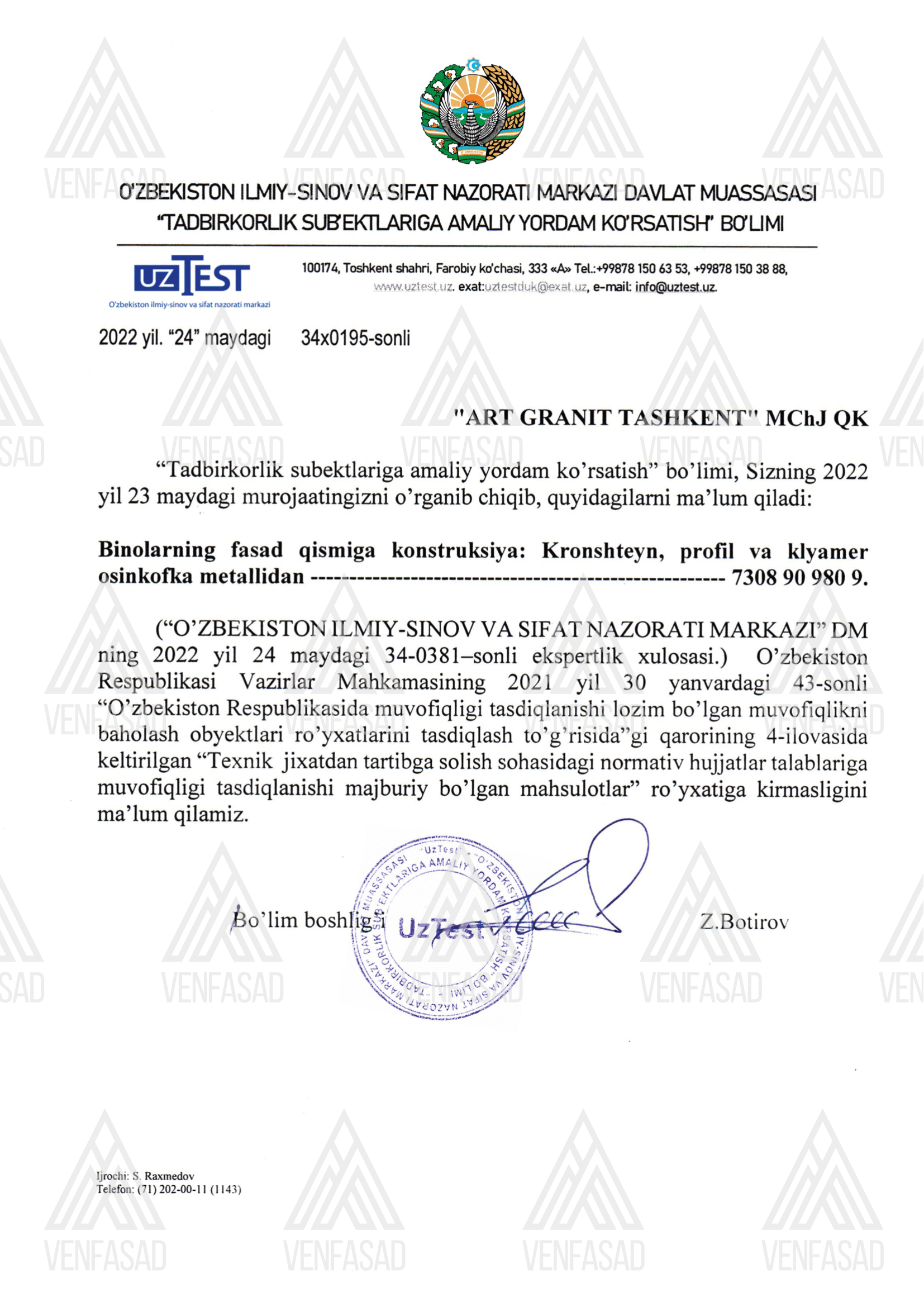 «ART GRANIT TASHKENT» MChJ XK ventilyatsiyalanadigan fasad tizimlari uchun butlovchi qismlarni yetkazib beradigan yetakchi ishlab chiqaruvchi hisoblanadi. Qalinligi 1,2 mm dan 2 mm gacha bo‘lgan, yuzasi 100 mikron rux bilan qoplangan yuqori sifatli po‘latdan yasalgan buyumlar taklif qiladigan asosiy mahsulotimiz hisoblanadi. Qariyb 20 yildan beri kompaniyamiz ventilyatsiyalanadigan osma fasadlar, jumladan, yuza maydoni va sirtining murakkabligi har qanday fasadlar uchun butlovchi qismlarni yasash va yetkazib berishga ixtisoslashgan. Ishlab chiqarishda faqat sertifikatlangan materiallarni ishlatish evaziga biz mahsulotimizning yuksak sifati va ishonchliligini ta’minlaymiz.